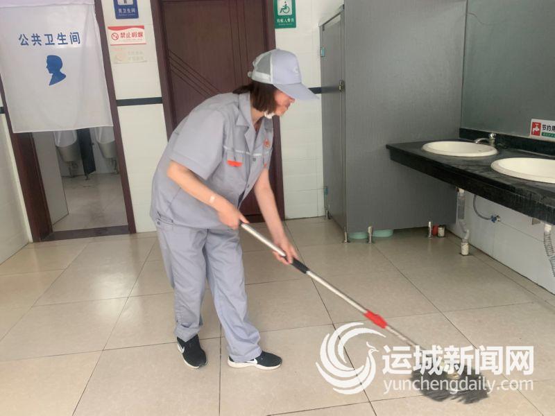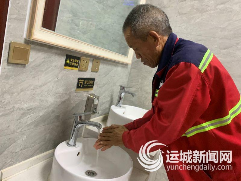 環(huán)衛(wèi)工人在公廁內(nèi)洗手
