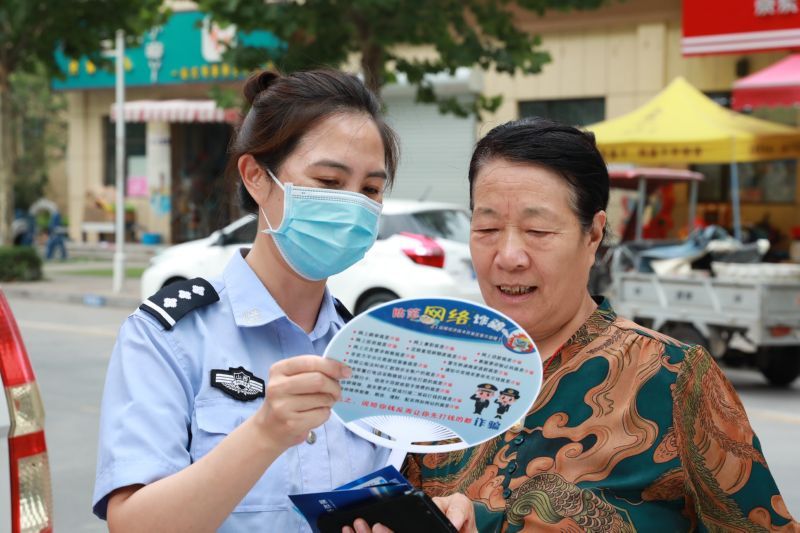 ▲民警向市民宣傳“防范網(wǎng)絡(luò)詐騙”相關(guān)內(nèi)容