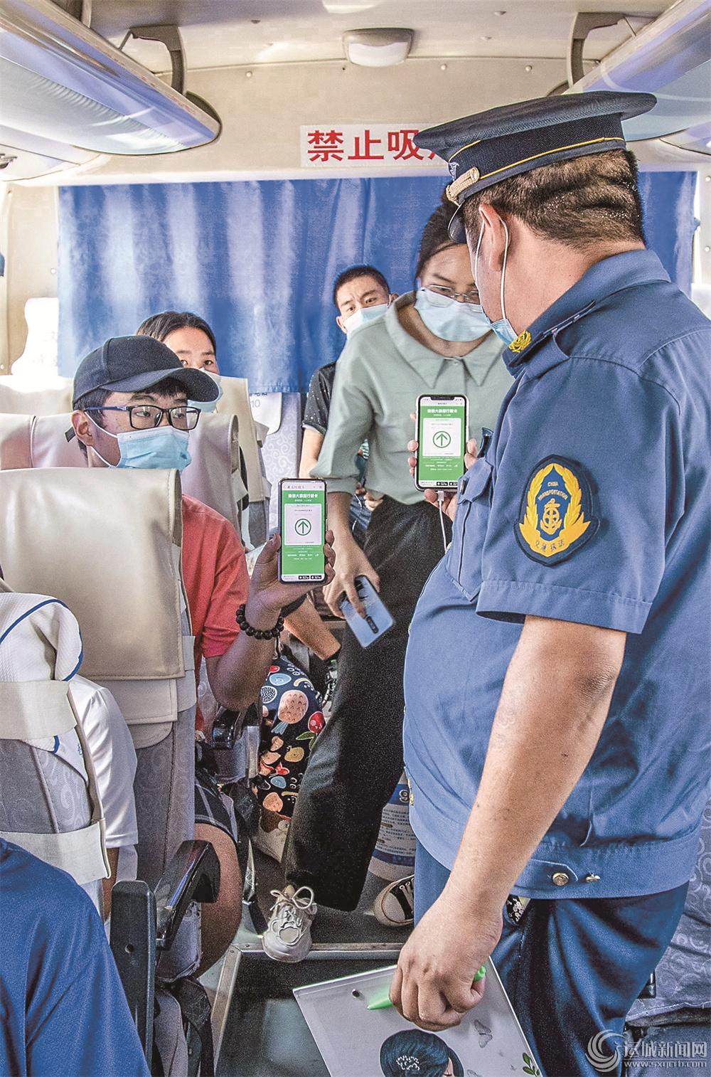 我市一疫情防控檢測點工作人員檢查乘客健康碼和行程碼