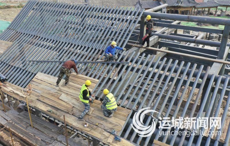 鹽池文化博覽園項目建設工地,工人在加緊施工。