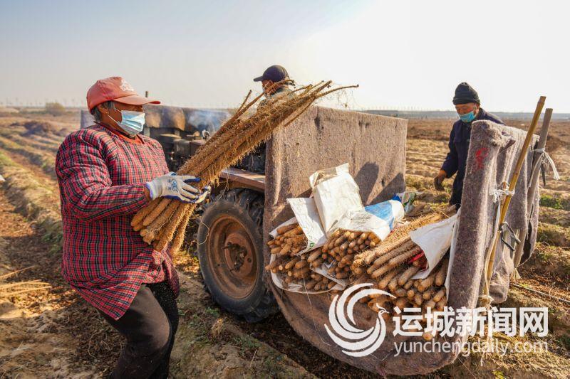 11月29日,河津黃河灘地萬畝山藥喜獲豐收,農民們忙著收獲、挑揀、運輸。
