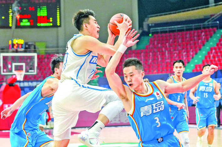 當日,在吉林長春進行的2021~2022賽季中國男子籃球職業聯賽(CBA)第二階段第23輪比賽中,寧波甬興證券隊以78比119不敵青島每日優鮮隊。(新華社記者 張楠 攝)