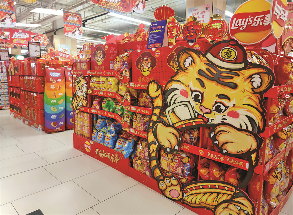 紅紅火火的裝飾品是必不可少的年貨。在永輝超市萬達店,進門顯眼位置的大紅燈籠、春聯、“福”字、中國結、紅包等,將超市映襯得紅火喜慶,吸引著來來往往的顧客。