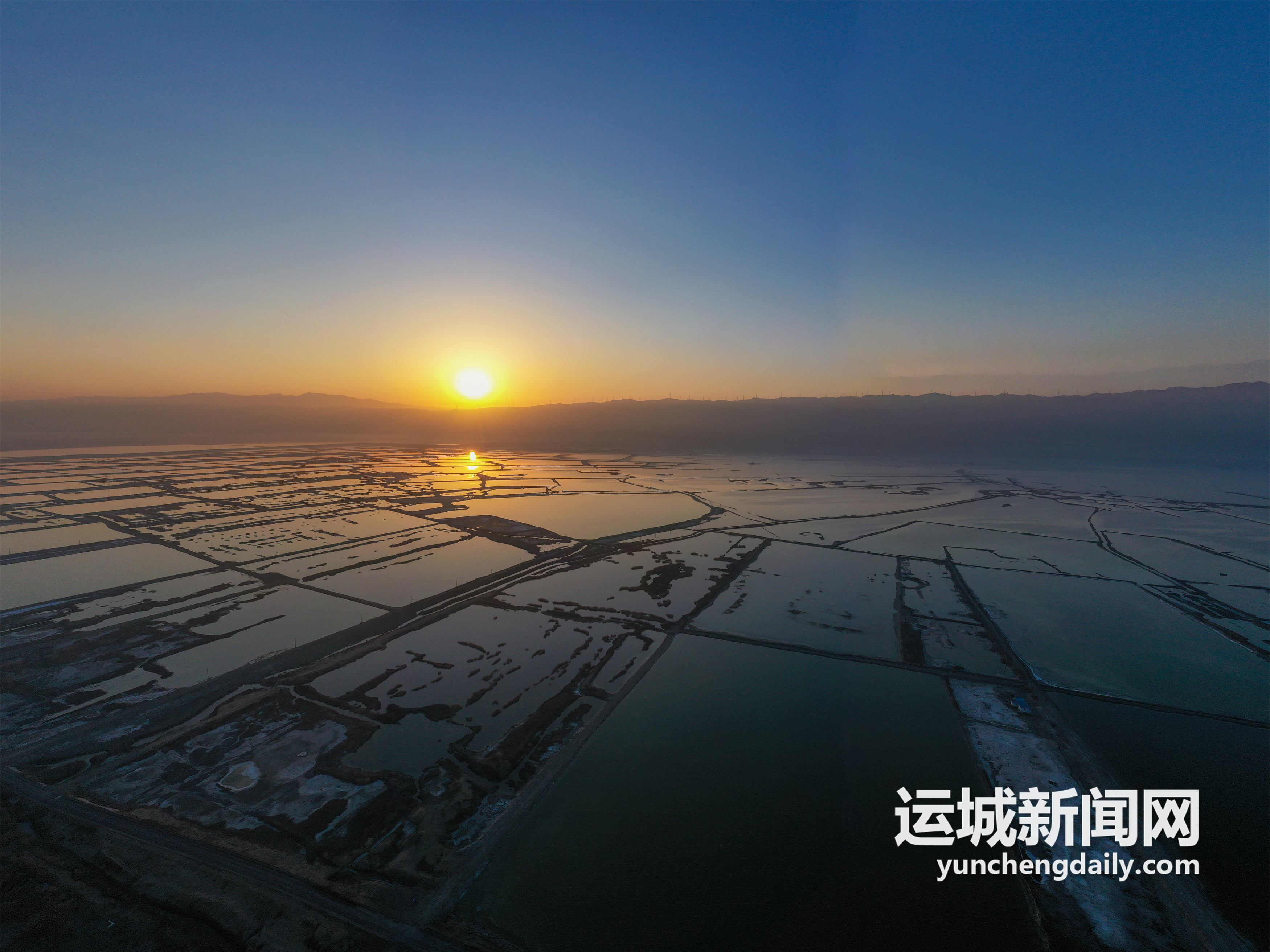 2022年2月1日,大年初一,初升的朝陽映襯鹽湖、中條山景觀,構成一幅新年旭日東升美景圖。記者 閆鑫 攝