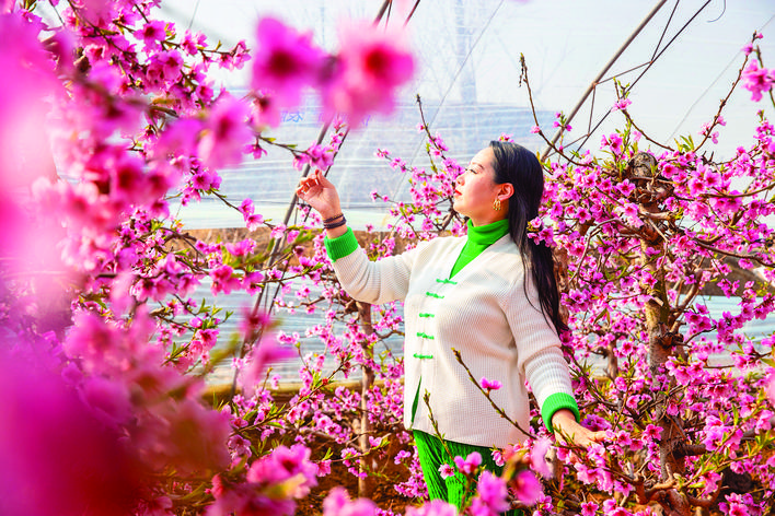 ▲2月4日,夏縣一名女子在桃花棚里拍抖音,宣傳推介家鄉(xiāng)的特色農(nóng)業(yè)。該縣南大里鄉(xiāng)郭牛、北晉等村日光溫室里的桃花競相綻放,姹紫嫣紅,芳香四溢。