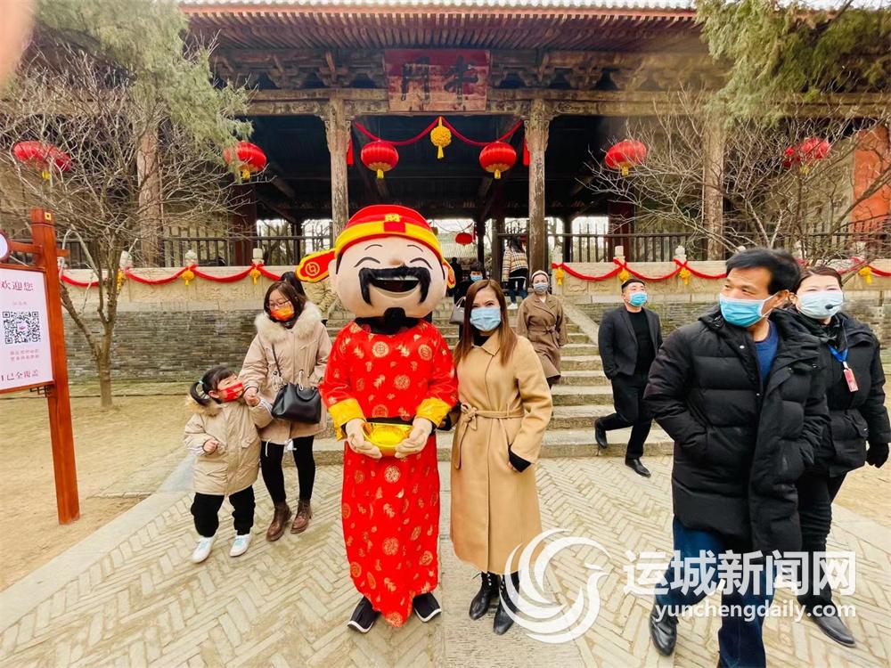 大年初五,一名游客在解州關(guān)帝廟景區(qū)與“財(cái)神”合影。