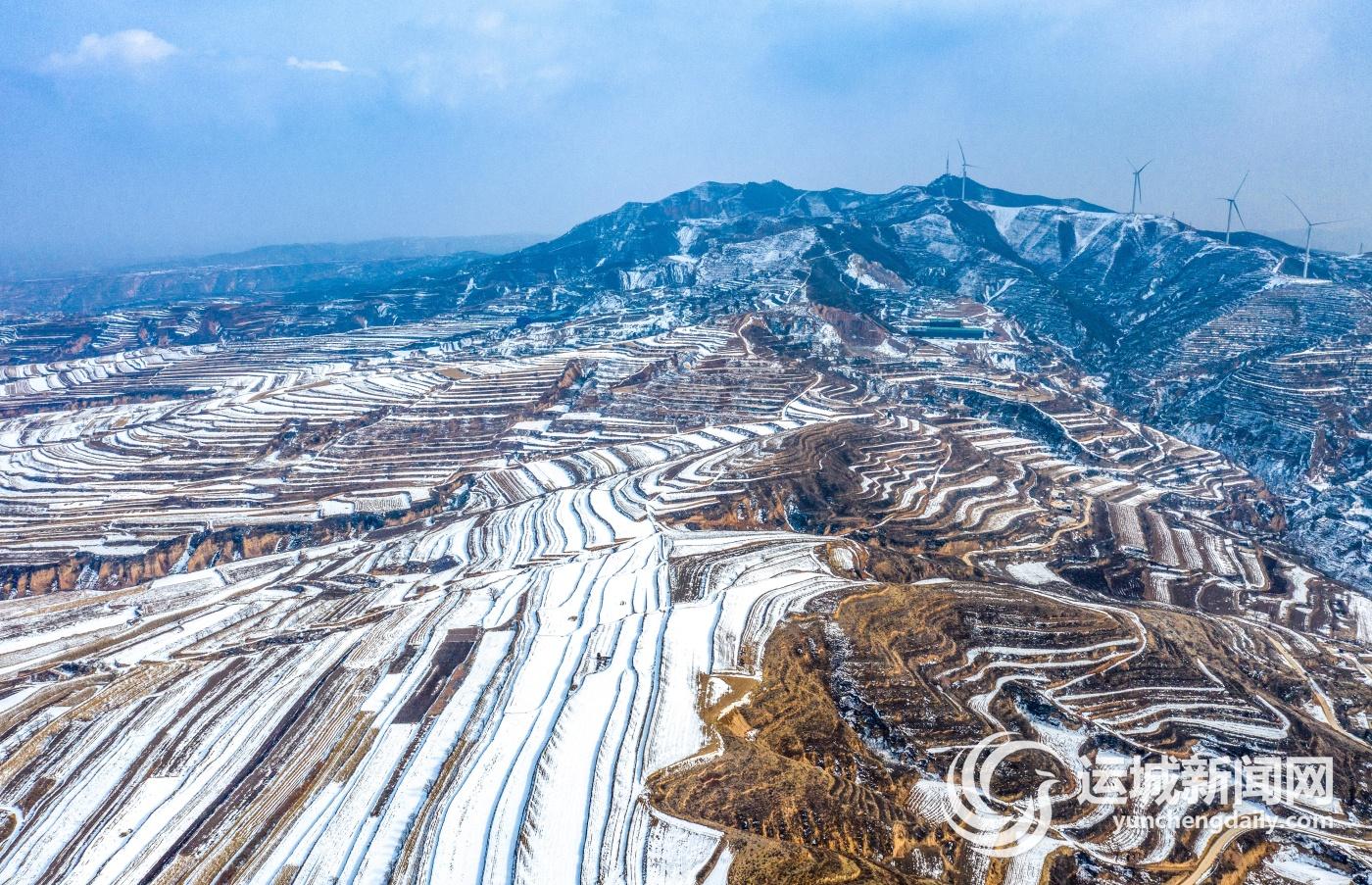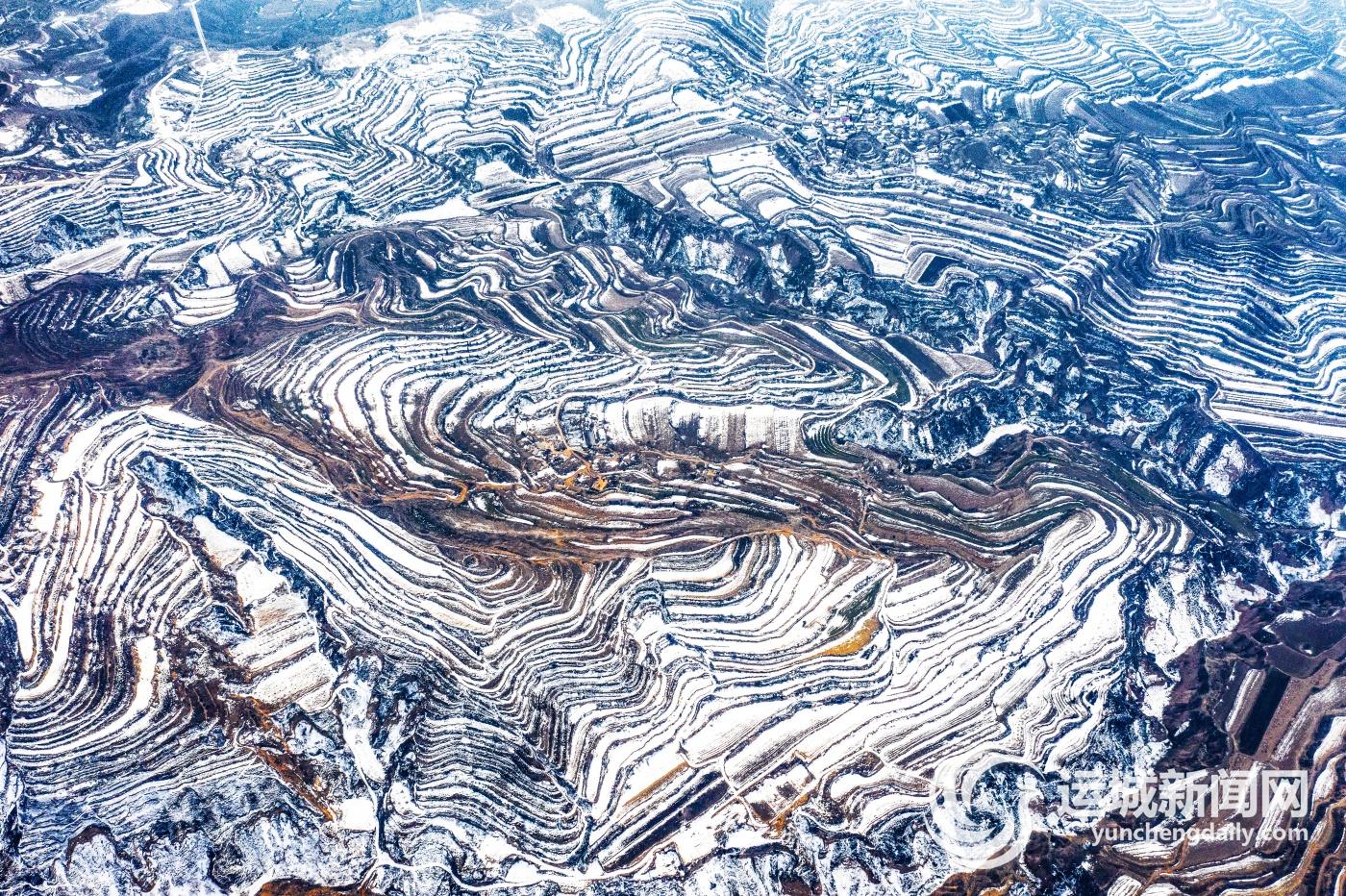 近日,五龍村的梯田被白雪覆蓋,從空中俯瞰,錯落有致的雪線蜿蜒在黃土大地上,與遠處的青山白雪遙相呼應,壯美非常。