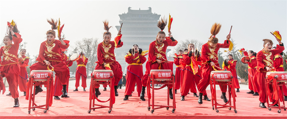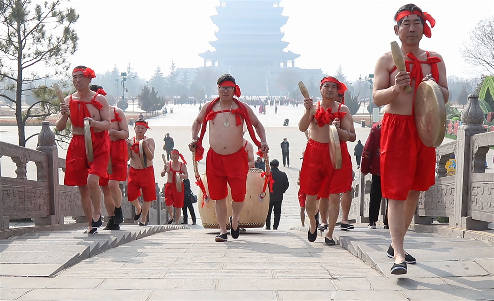 ▲2月15日,夏縣瑤峰鎮農民社火隊為游客表演。特約攝影 姚中吉 攝