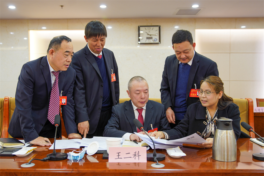 2月23日,市人大代表薛國飛、郭威立、張麗、劉曉霞、楊瑞濤(從左至右)審議市人大常委會和市法檢兩院工作報告。
