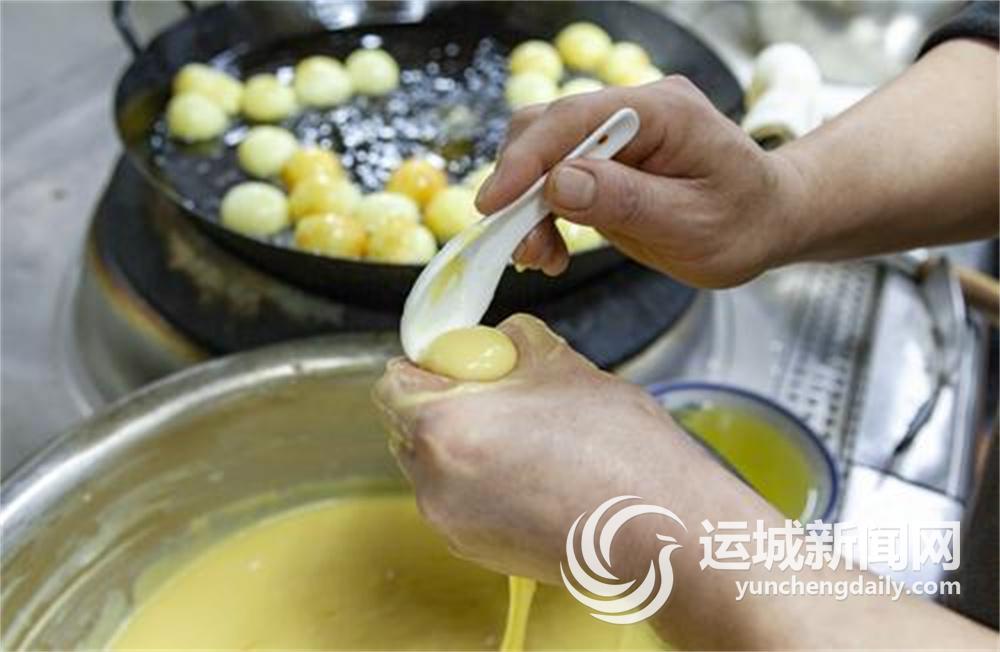 風(fēng)葫蘆是用面粉、糖、油制成的一道小吃,是河?xùn)|一道特色菜,更是運(yùn)城人逢年過節(jié)、紅白喜事必備的看家菜。其中間空心,吃起來有一股風(fēng)從里面“竄”出來,這才名曰風(fēng)葫蘆。