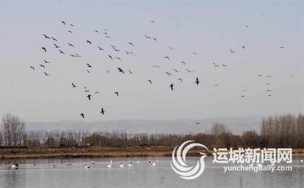 2月26日,棲息在萬榮縣黃河濕地的白天鵝和赤麻鴨或在水中嬉戲、覓食,或在空中成群飛翔,構成一幅美麗的圖畫。