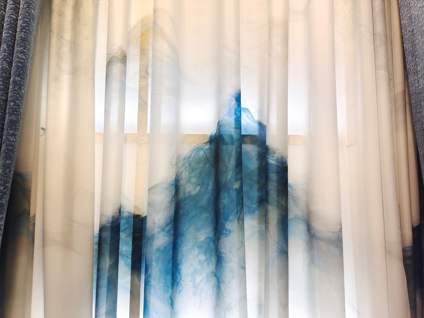 低價高品成品系列中的“青綠”款雪紡3D印花紗簾,則適合新中式風格家裝。紗面上印有“青綠”背景山川,3D印花立體感較強,呈現出層巒疊嶂的美感。多層次的印花設計,更具意境美。裝飾在家里,如夢如幻?!吧剿笨罡呔懿馁|布簾則更厚實,遮光效果好,又不壓抑,再采用金色絲線,配以細致的繡工,一幅山川刺繡圖躍然簾上,更顯高貴氣質,提升家裝檔次。