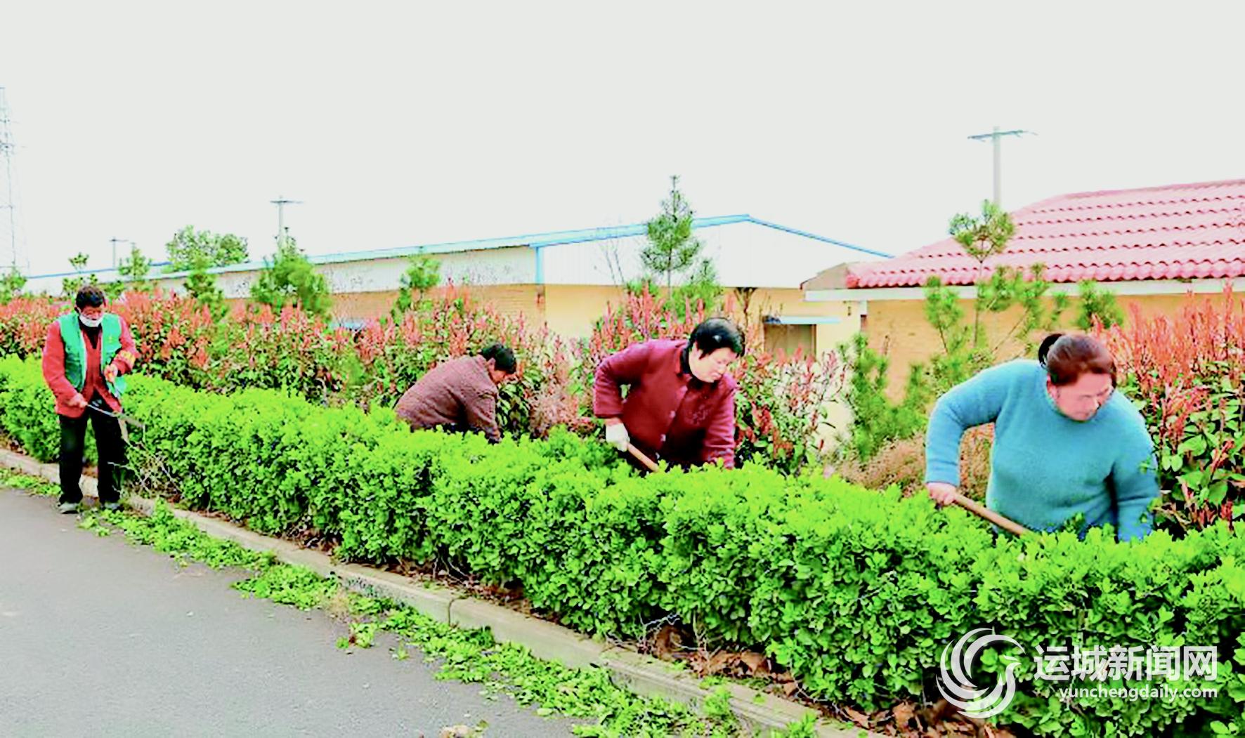 ▲3月20日,夏縣泗交鎮(zhèn)嗚條新村村民在綠化帶除草、修剪樹木。