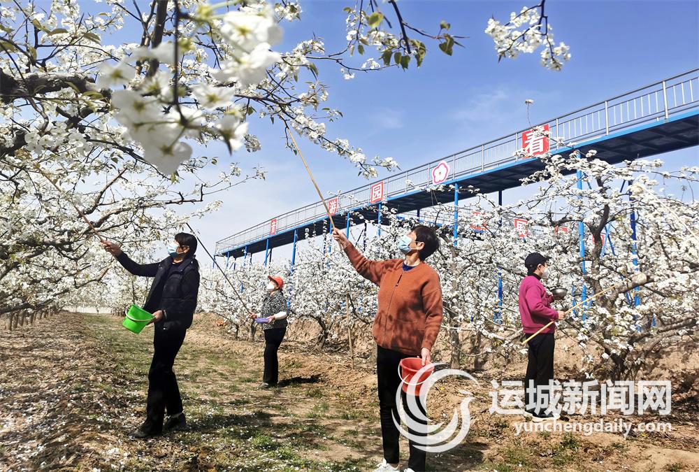 3月28日,臨猗縣黃斗景村村民對梨花進行人工授粉。