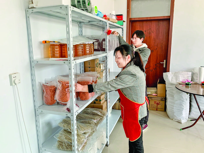 走進張志花家東側的一個房間,幾個貨架上整齊擺放著包裝好的干花椒、紅薯粉條、辣椒面等農產品。