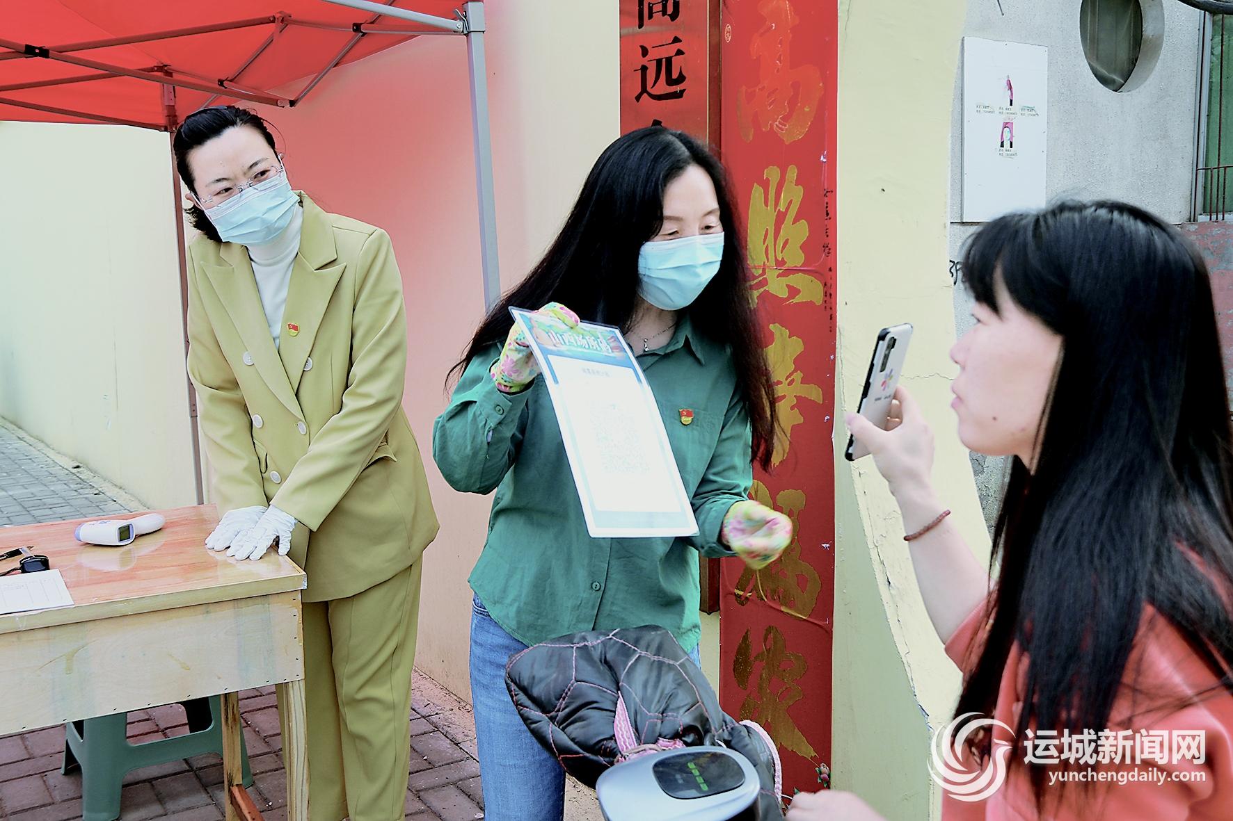 聞喜縣統(tǒng)計(jì)局志愿者在包聯(lián)的群英苑小區(qū)門口,要求進(jìn)入小區(qū)人員掃描場所碼。