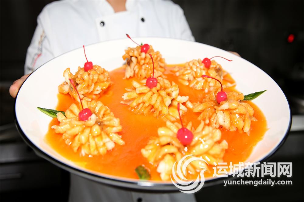 在運(yùn)城,菊花魚作為魚肉糖醋做法的一種代表性美食,是當(dāng)?shù)氐囊坏纻鹘y(tǒng)名菜。其實(shí),菊花魚并沒有菊花入菜,而是把魚改刀成菊花形狀,沾上淀粉油炸后澆上酸甜醬汁,盛入盤中。擺盤后的菜品,宛如朵朵盛開的菊花,散發(fā)出陣陣誘人的芳香。
