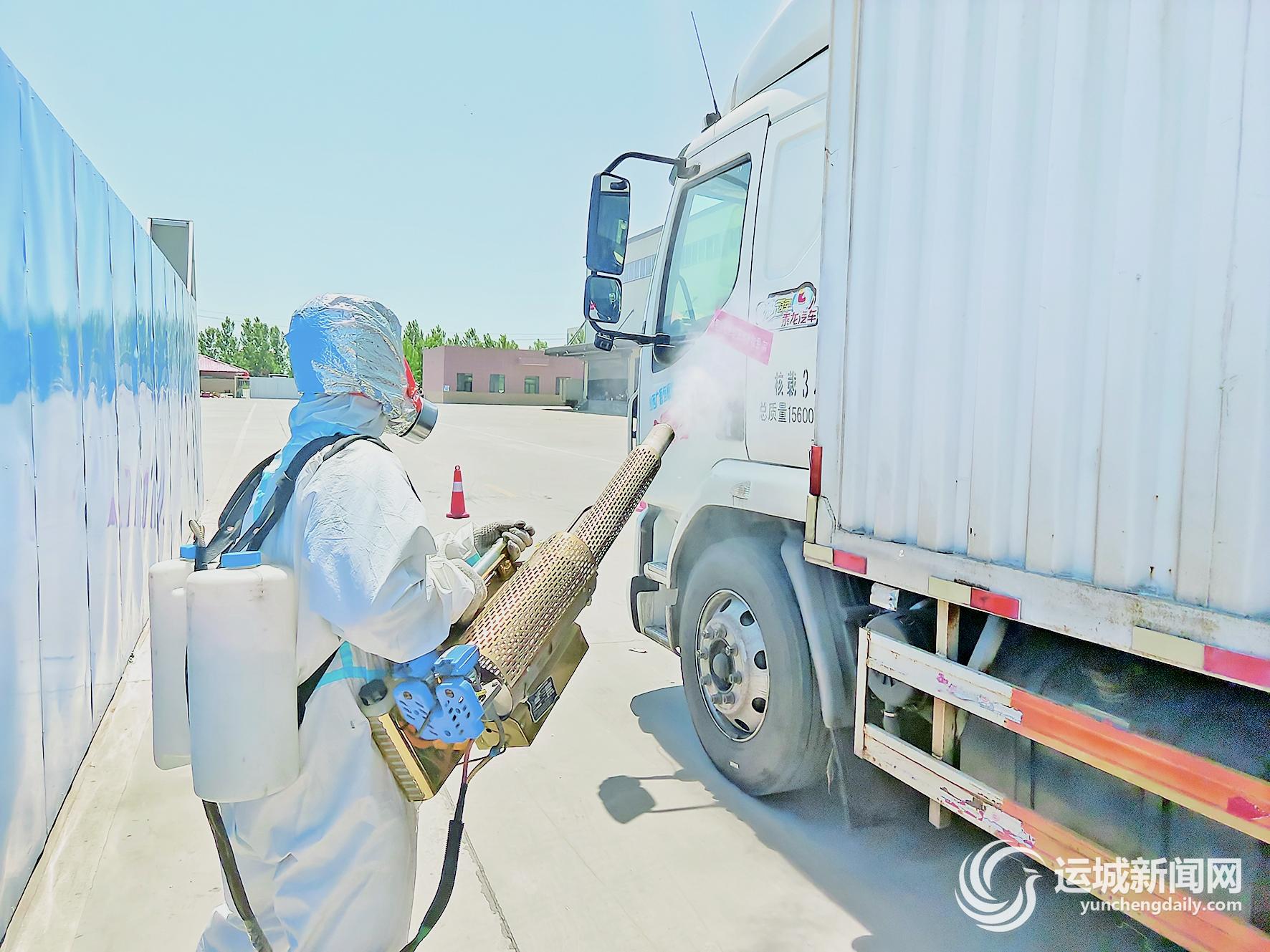順豐運城楚侯中轉場,工作人員對卸完貨的車輛進行消殺。 裴旭薇 攝