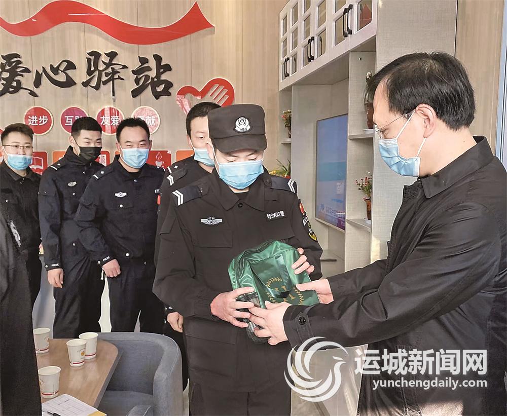 近日,新絳縣委副書記儀天亮在愛心驛站為保安人員發放愛心防疫包。
