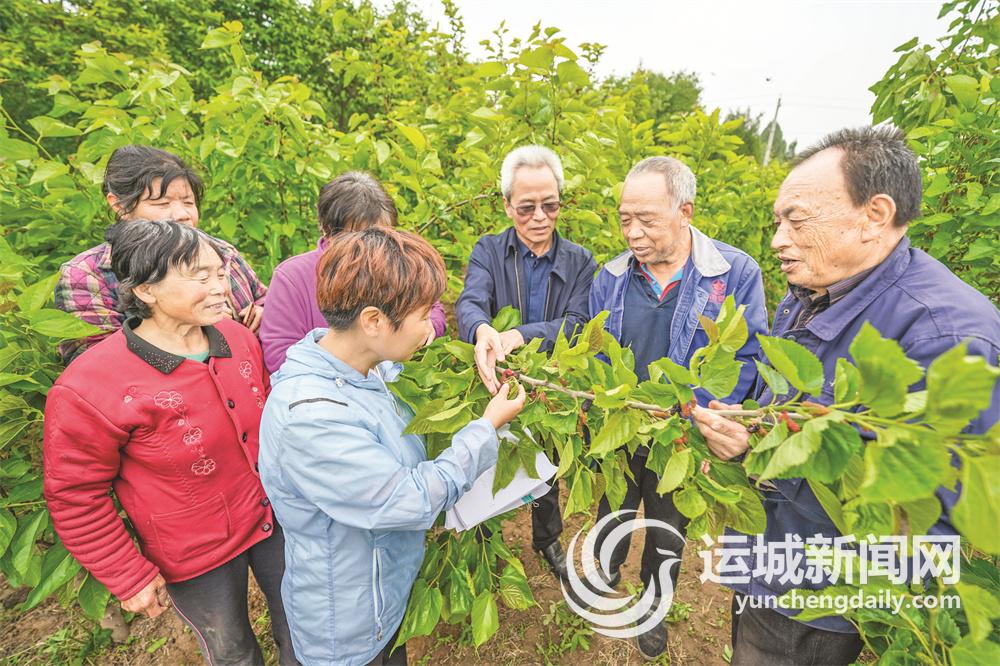 5月11日,芮城縣陌南鎮(zhèn)上文村,山西農(nóng)業(yè)大學(xué)蠶科院技術(shù)團成員在給村民講解桑葚種植技術(shù)。