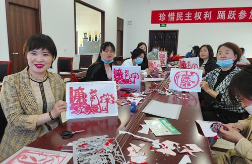 5月17日,芮城縣婦聯組織鄉鎮、社區婦聯,以及部分縣直單位婦委會婦女代表,在永樂社區家庭教育實踐創新基地開展“涵養廉潔文化,建設清廉芮城”家庭助廉剪紙活動。圖為婦女代表在展示剪紙作品。