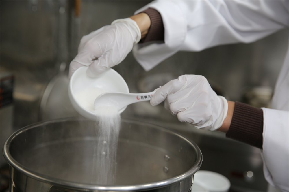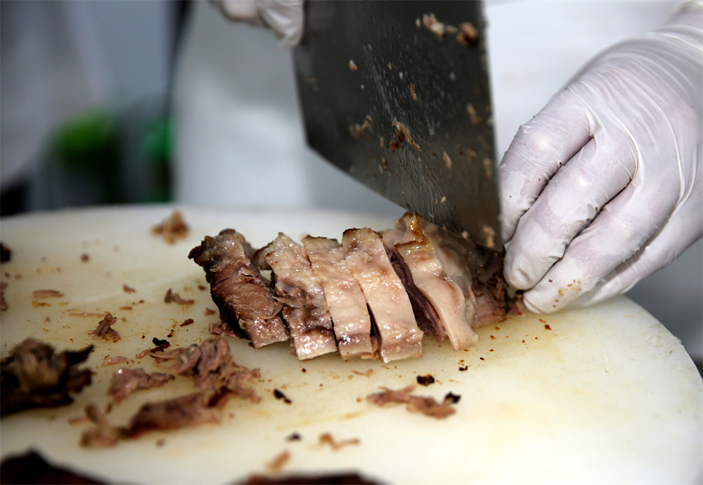 在隆興美,廚師傳承傳統(tǒng)的制作工藝,選用草原肥美的白條羊背,首先扎皮,一來疏松肉質(zhì),二來便于入味。隨后,用10余種中草藥和天然調(diào)味品加水煮肉,煮好的羊脊骨要在特制烤箱中經(jīng)過4個小時左右的烘烤。然后,改刀、裝盤,配上辣椒粉、孜然粉、糖蒜、洋蔥等蘸料配菜。這樣,食客就可根據(jù)個人口味享用美味了。