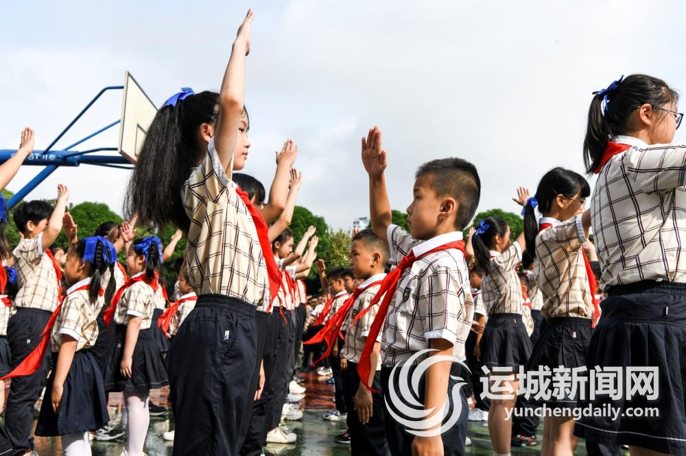 5月31日,廣西南寧市濱湖路小學(xué)的少先隊(duì)員在入隊(duì)儀式上互敬少先隊(duì)隊(duì)禮。 新華社記者 曹祎銘 攝