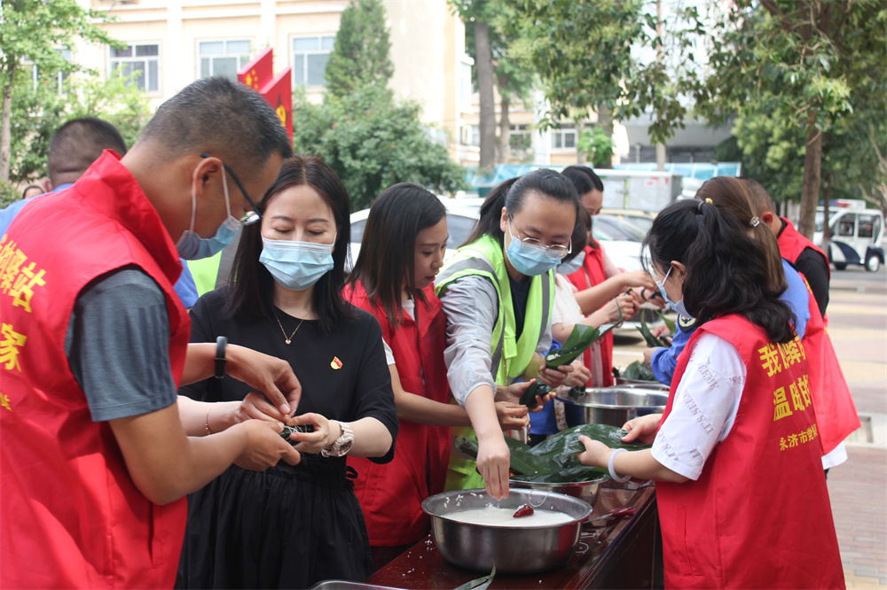 活動中,黨員干部與市民圍在一起包粽子,為環衛工人、城管人員和快遞小哥等送上粽子、雪糕、綠豆水、西瓜、甜瓜、端午香囊等節日慰問品,拉近了黨群距離,增進了黨群感情,與市民共同迎接端午節的到來。