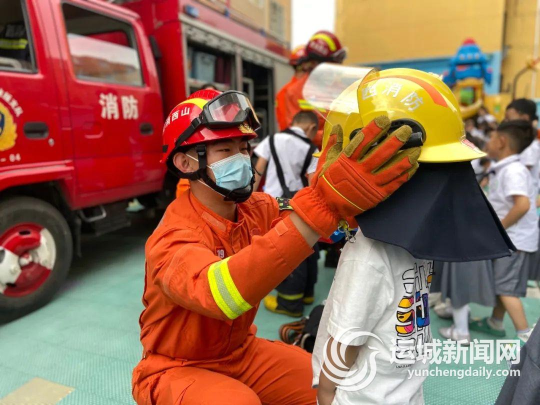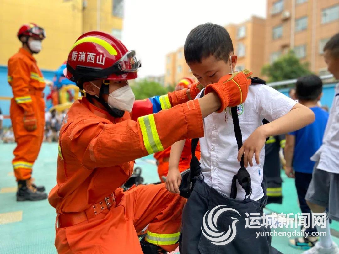 永濟消防宣傳人員結(jié)合幼兒園發(fā)生火災(zāi)的特點及日常生活中的逃生自救常識,用通俗易懂的語言講解了如何報警求助、逃生自救及正確使用滅火器等知識。隨后,消防員邀請小朋友們試穿消防戰(zhàn)斗服、佩戴消防頭盔(上圖),激發(fā)小朋友關(guān)注消防、學習消防的積極性和主動性,讓他們在親身體驗中學習掌握消防安全常識、緊急避險知識和自防自救技能。