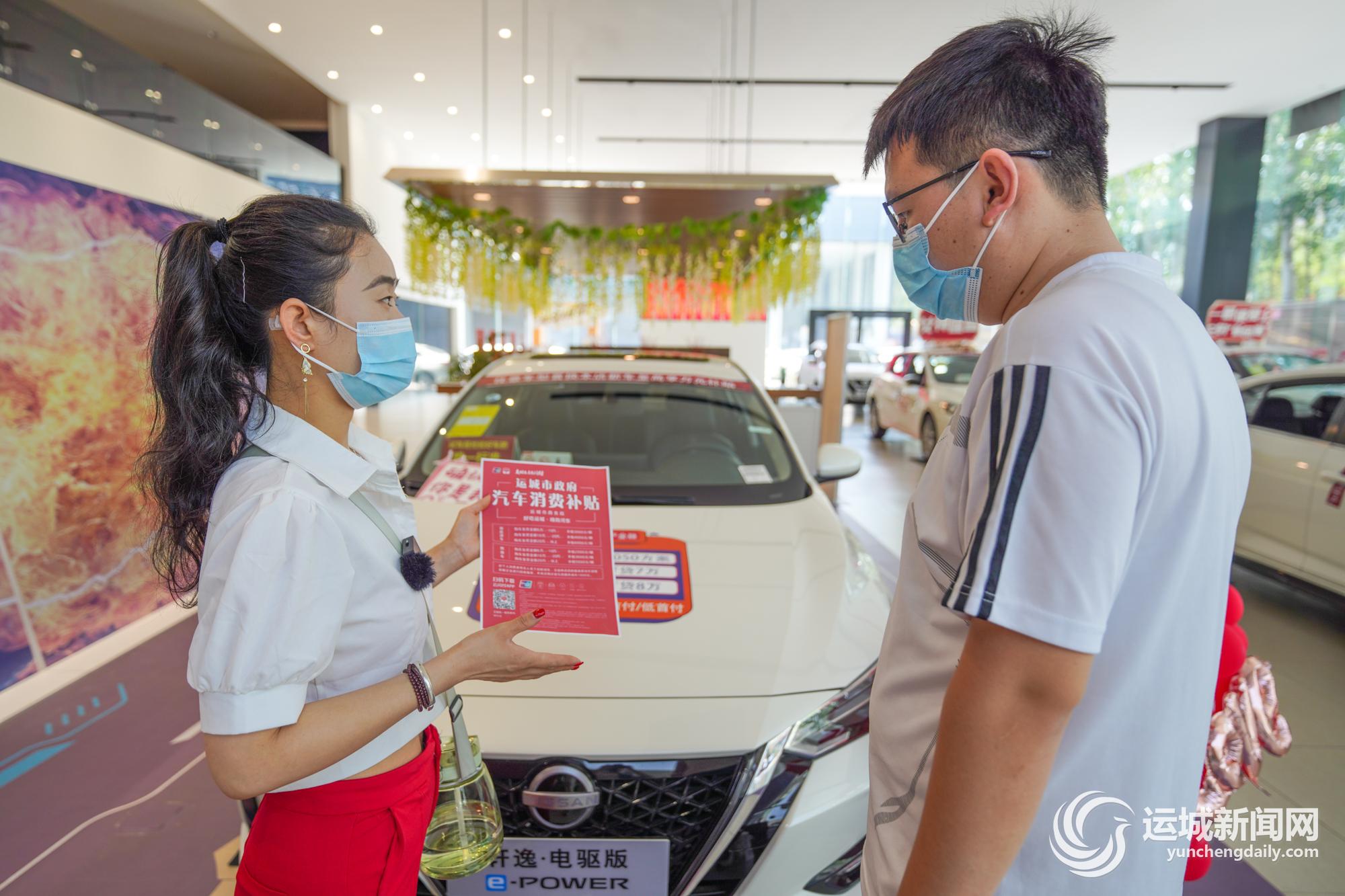 諾維蘭汽車公園東風日產瑞盈店工作人員為客戶介紹汽車消費補貼和新能源汽車。記者 陳方斌 攝