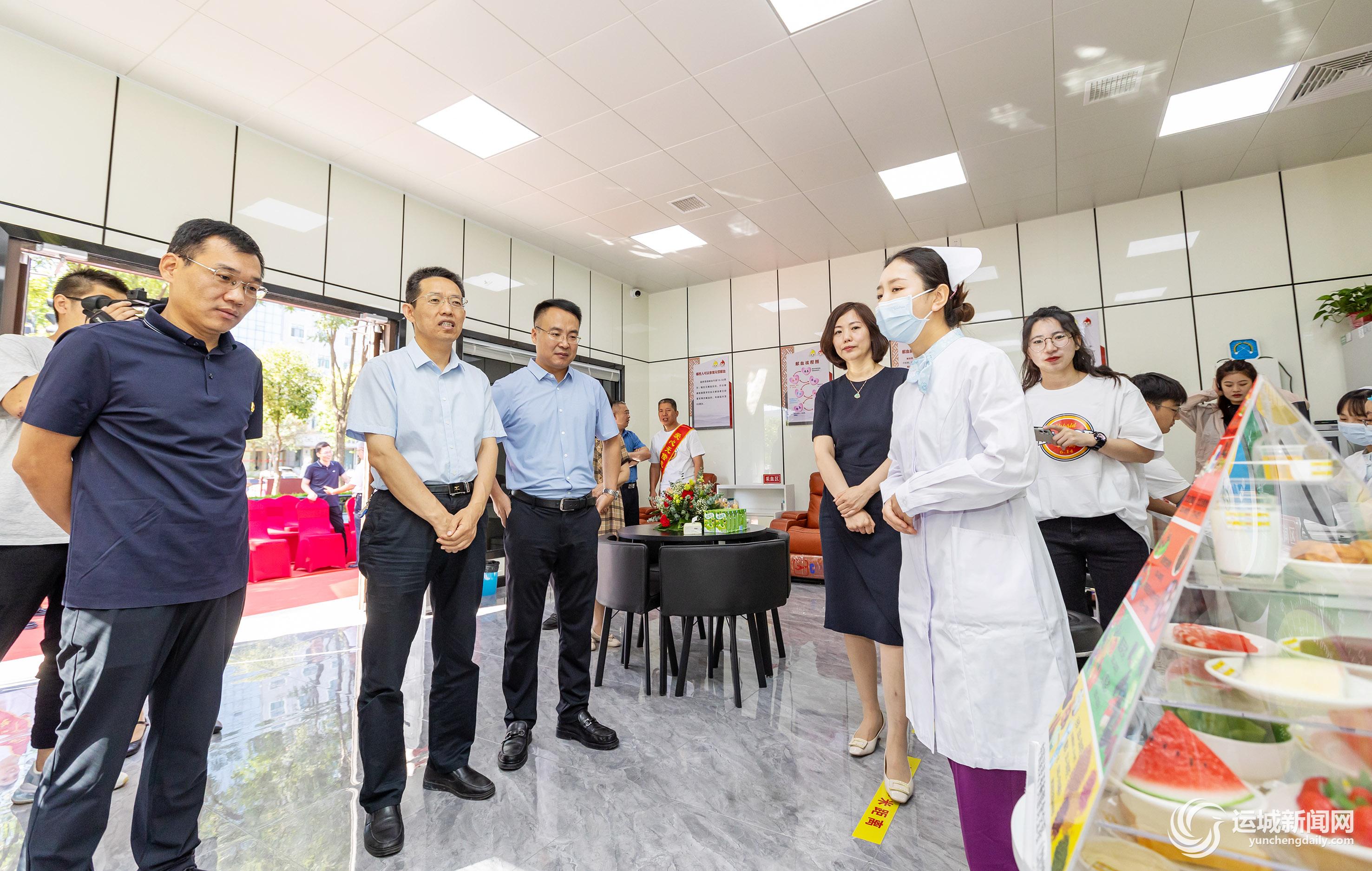 市衛健委副主任張軍龍、市紅十字會專職副會長閆樂等在獻血屋查看設備配備情況