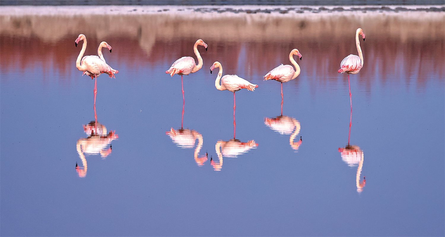 幾只火烈鳥在鹽池漫步