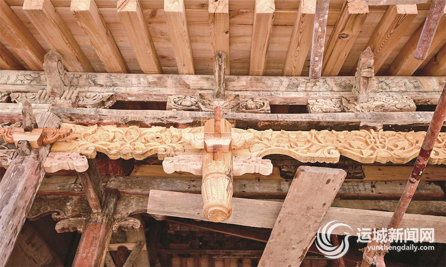 “原先坍塌的墻面已經(jīng)用條磚砌筑、土坯磚砌筑修補好了,但其上原先繪有龍翔云天題材的彩色壁畫暫時還未復原?!蓖鯘檶庮I(lǐng)著記者繞戲臺一周,在戲臺北面停下,指著上方房檐處明黃色木雕與一旁古樸斑駁木雕形狀一致的花板,繼續(xù)說,“得虧第三次文物普查時就做好了數(shù)字檔案留存工作,我們這才能依照清晰的花板圖片和翔實的數(shù)據(jù)資料進行還原,補全缺失的部分。”花板上的木雕皆由技藝精湛的匠人手工雕刻,力求恢復原狀。早在5月20日,匠人師傅已經(jīng)開始了花板復原工作,他們依照史料,一刀一刀使木雕重現(xiàn),僅此一項就耗時近20天時間。
