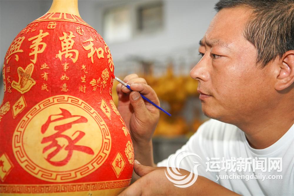裴唐宇在為“家和萬事興”葫蘆上色。