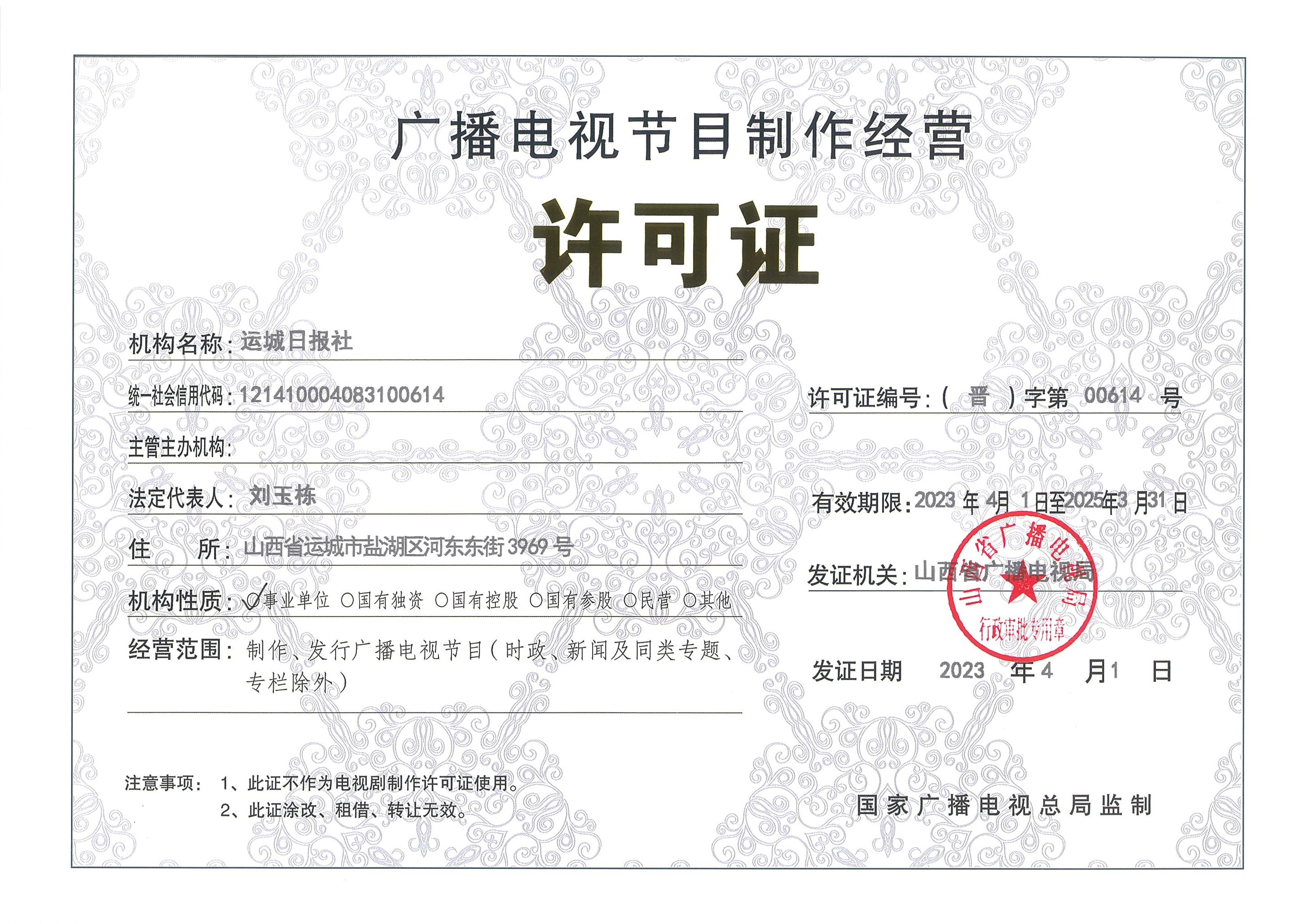 廣播電視節(jié)目制作經(jīng)營許可證 許可證編號:(晉)字第00614號