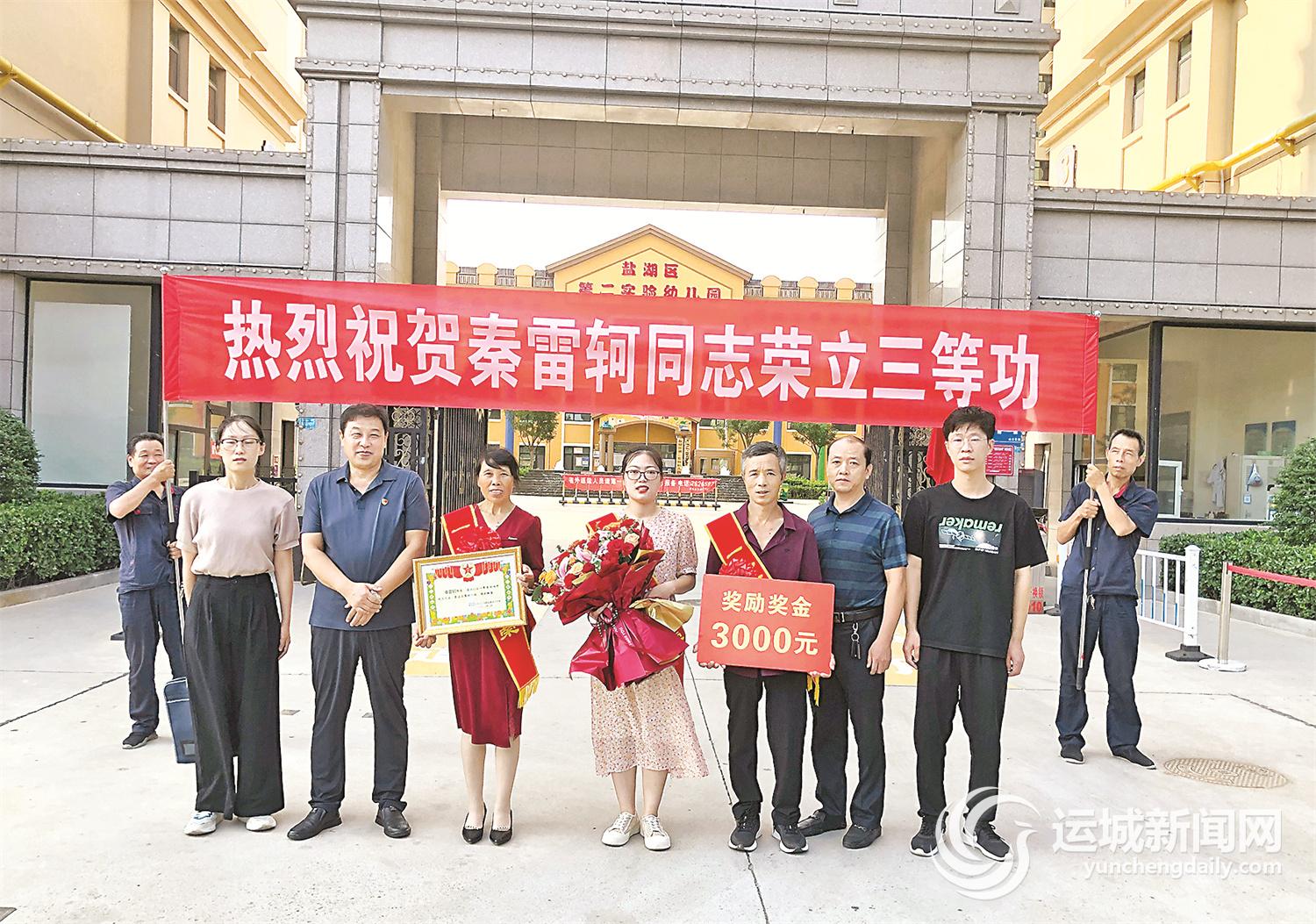 運城晚報訊(記者 荊毅萍)軍營創功績,故鄉傳美名。7月26日,鹽湖區安邑街道外灘首府社區聯合區退役軍人事務局,來到榮立三等功的現役軍人秦雷軻家中,將三等功喜報和慰問金送到他的家人手中,并向他們表示熱烈祝賀。