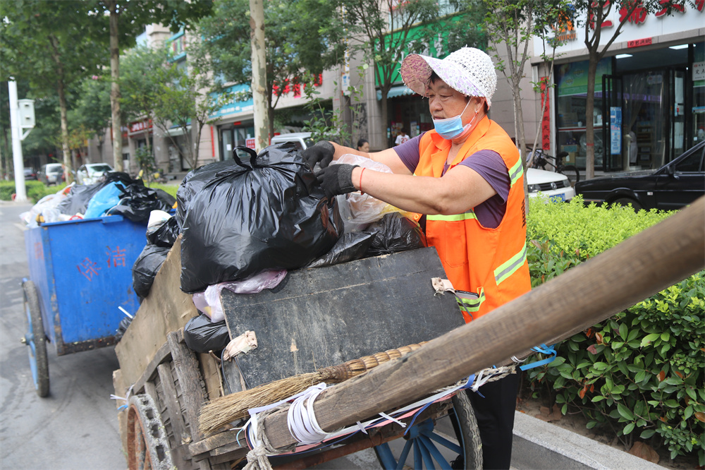 ▲7月26日,張文菊在聞喜縣城公園壹號門口轉運垃圾。