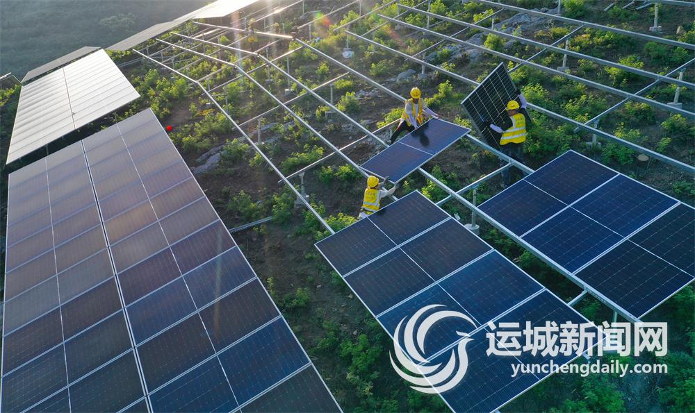 8月10日,位于垣曲縣皋落鄉的100兆瓦多能互補光伏發電項目建設工地,工人在安裝光伏板。