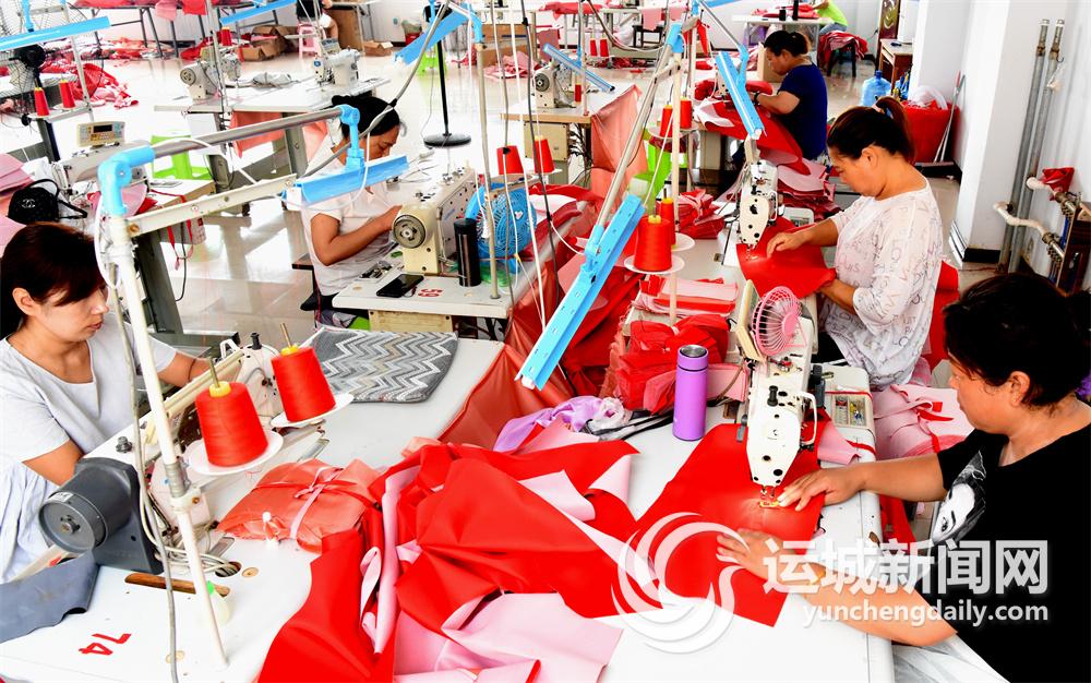 8月14日,垣曲縣新城鎮(zhèn)瓦舍新村移民幫扶車間,搬遷移民在加工紅馬甲。