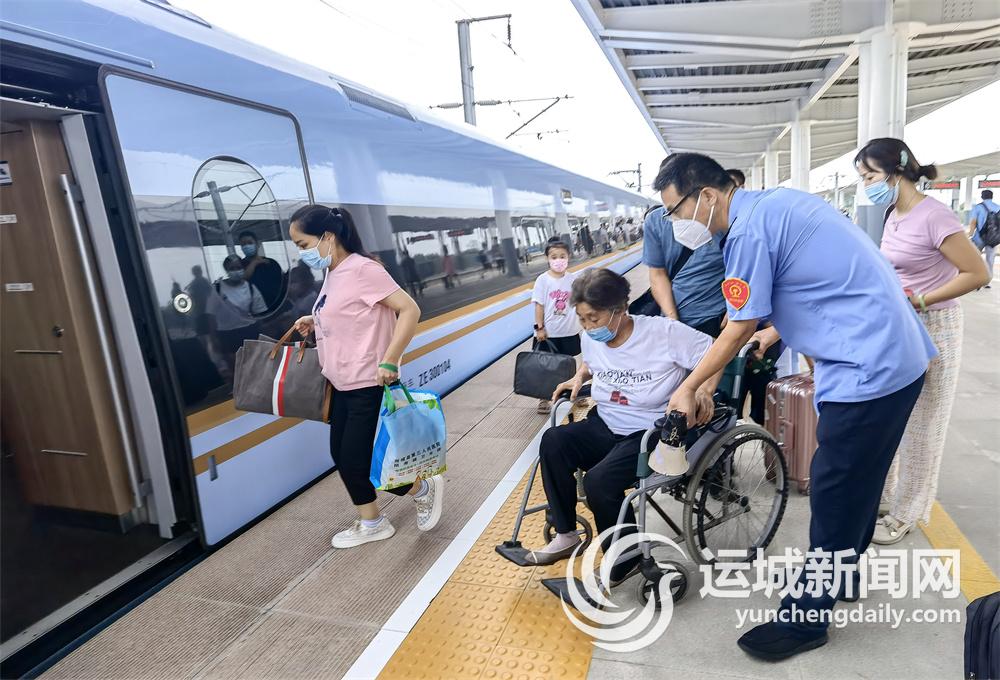 圖為8月15日,運城北站客運人員幫扶重點旅客上車。