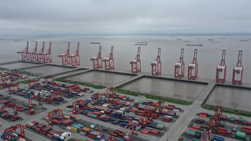 9月14日,江蘇省太倉港集裝箱碼頭停止作業,39臺岸橋大臂全部收起(無人機照片)。