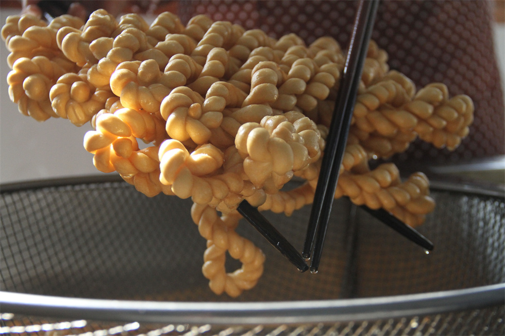 揉、搓、扯、拉、扭,一根面條三下五除二就“三股合一”成了麻花胚子;