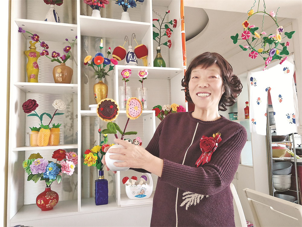 穿舊的毛衫,經(jīng)她鉤織變成了沙發(fā)墊、女士包;彩色絲襪、塑料袋,經(jīng)她捯飭變成了一束束“杏花”“梅花”;洗衣液、洗潔精塑料瓶,經(jīng)她剪裁變成了花籃、筷子簍……