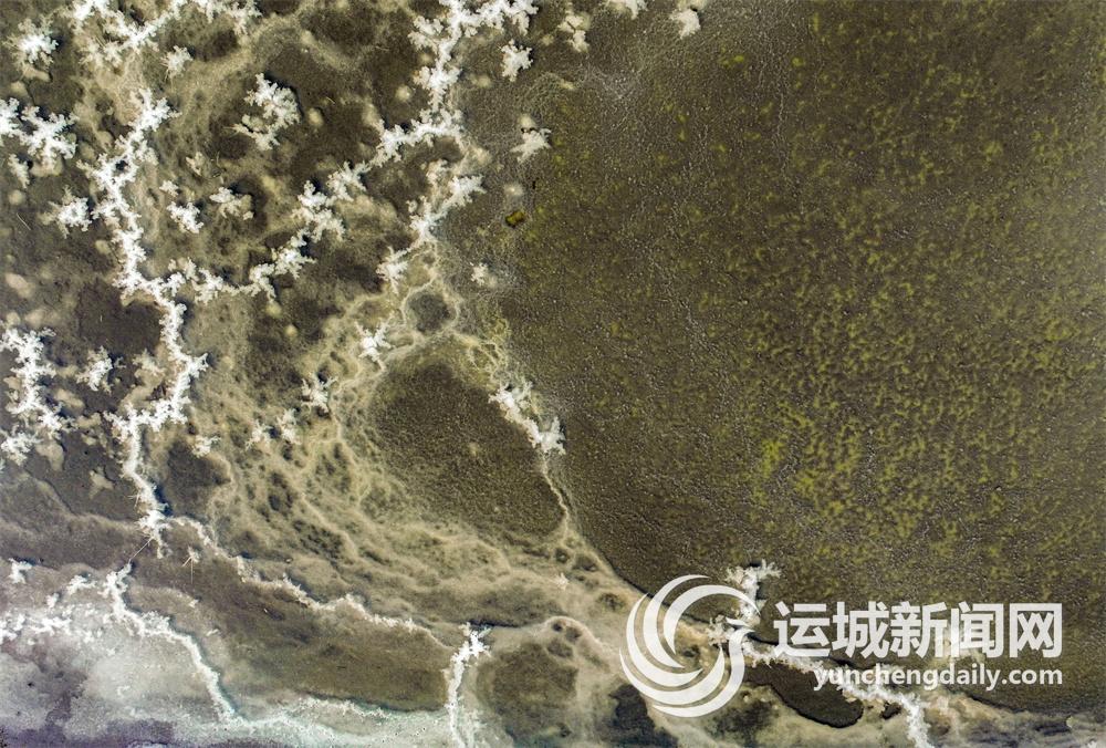 11月19日,隨著溫度逐漸降低,鹽湖綻放出美麗的“硝花”。