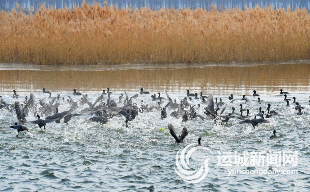 1月3日,國家二級保護動物白骨頂雞在稷山縣楊趙村汾河東灘嬉戲。