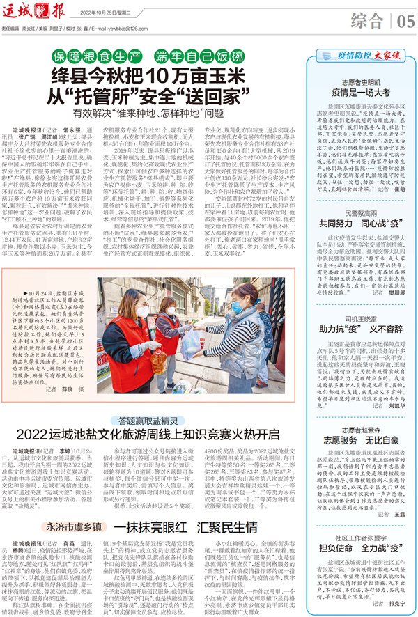 3.作品《保障糧食生產 端牢自己飯碗 絳縣今秋把10萬畝玉米從“托管所”安全“送回家” 有效解決“誰來種地、怎樣種地”問題》2022年10月25日記者 常永強 通訊員 張廣瑞 周江帆5版