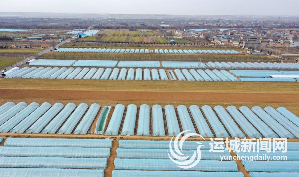 2月18日,俯瞰夏縣廣袤田野,整齊排列、形態各異的白色大棚與漸漸返綠的麥田、田間道路及樹木、村莊等,共同構成一幅生機盎然的春天美景。