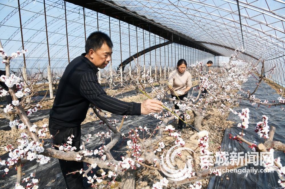 2月4日,聞喜縣郭家莊鎮宋店村村民在大棚里給杏花授粉。