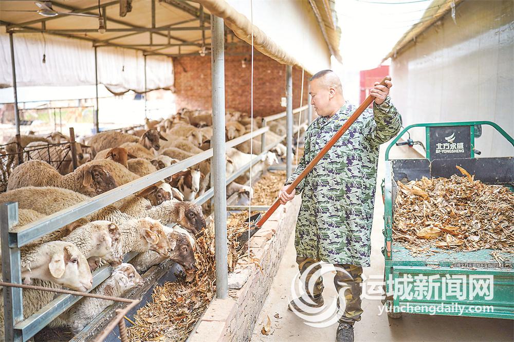 郝莊鄉(xiāng)薛家洼小山村張賓賓的養(yǎng)殖場(chǎng)內(nèi),張賓賓在給羊喂飼料。本報(bào)記者 陳方斌 攝