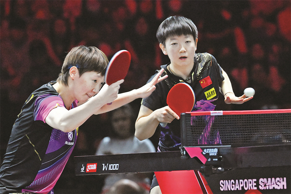 當日,在WTT新加坡大滿貫女雙決賽中,中國組合孫穎莎/王曼昱以3比2戰勝隊友陳夢/王藝迪,奪得冠軍。